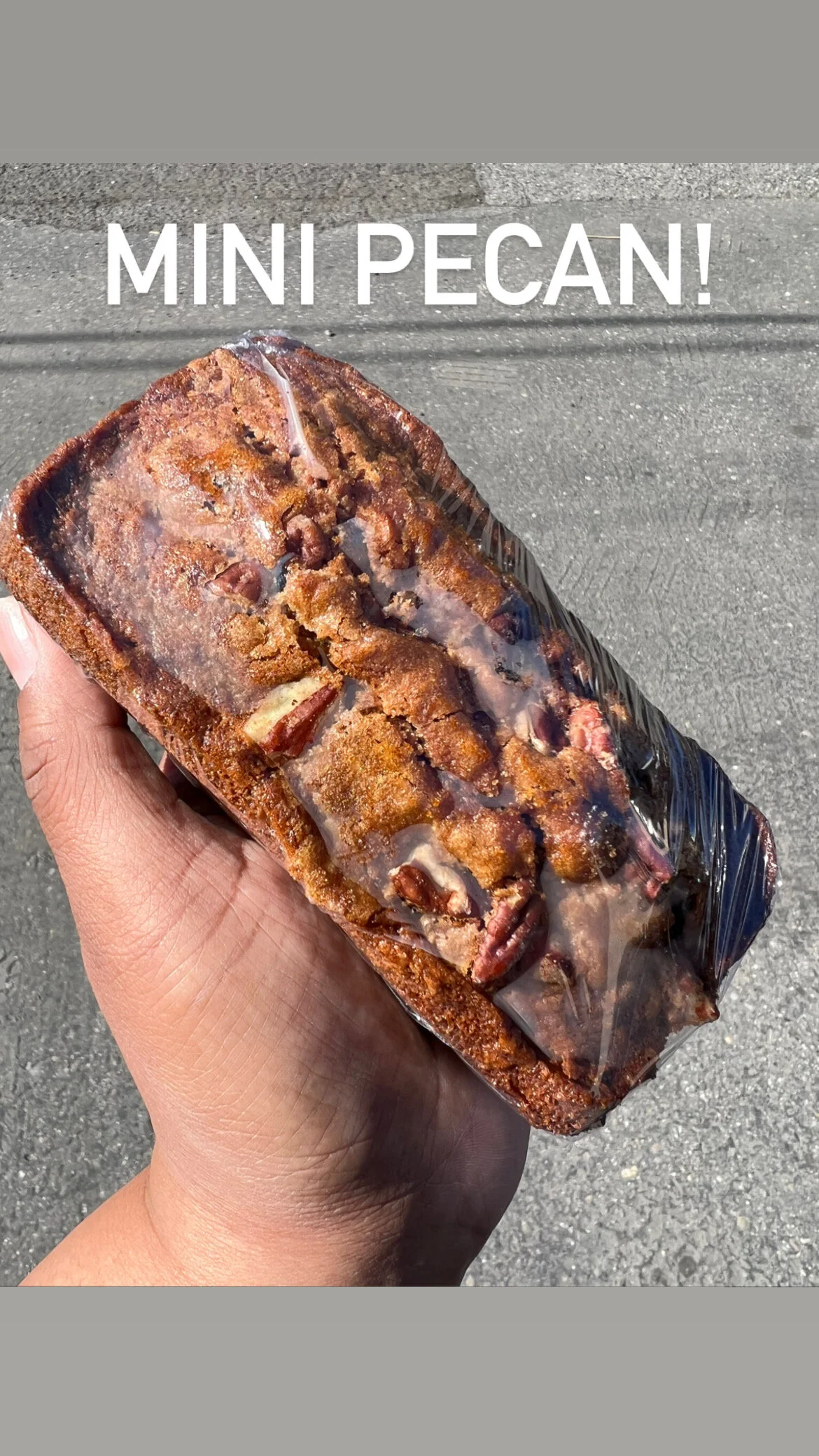 A banana bread loaf made with real butter, loaded with pecans. It has a moist texture with a hint of cinnamon and spice. Topped with our signature brown sugar crust and even more pecans.