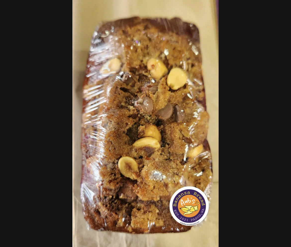 A caramel flavored banana bread loaf loaded with roasted salted peanuts and milk chocolate chips. It has a super moist texture with our signature hint of cinnamon spice. Topped with our signature crust and even more peanuts and milk chocolate chips.