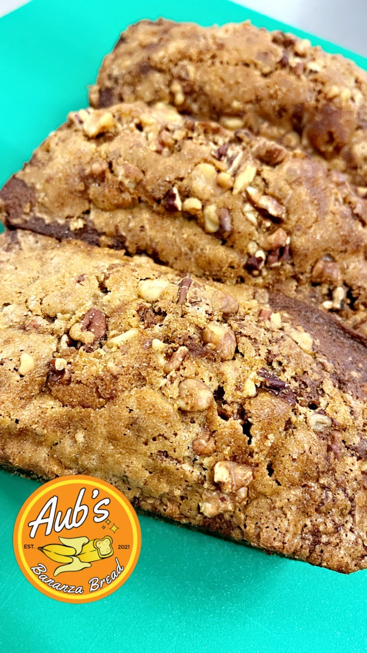 Aub’s original banana bread loaf loaded with chopped walnuts and chopped pecans. It has a super moist texture with a hint of cinnamon and spice. Topped with our signature brown sugar crust and more nuts.