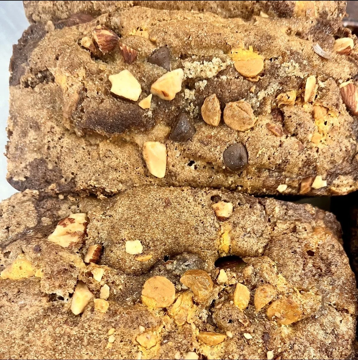 This flavor combines the complexity of caramel, the nostalgic sweetness of butterscotch and the satisfying crunch of roasted salted almonds, finished with semi-sweet chocolate chips. Topped with our signature brown sugar crust, resulting in a masterfully crafted, multi-layered gourmet banana bread that promises to captivate the senses and leave a lasting impression of indulgence.